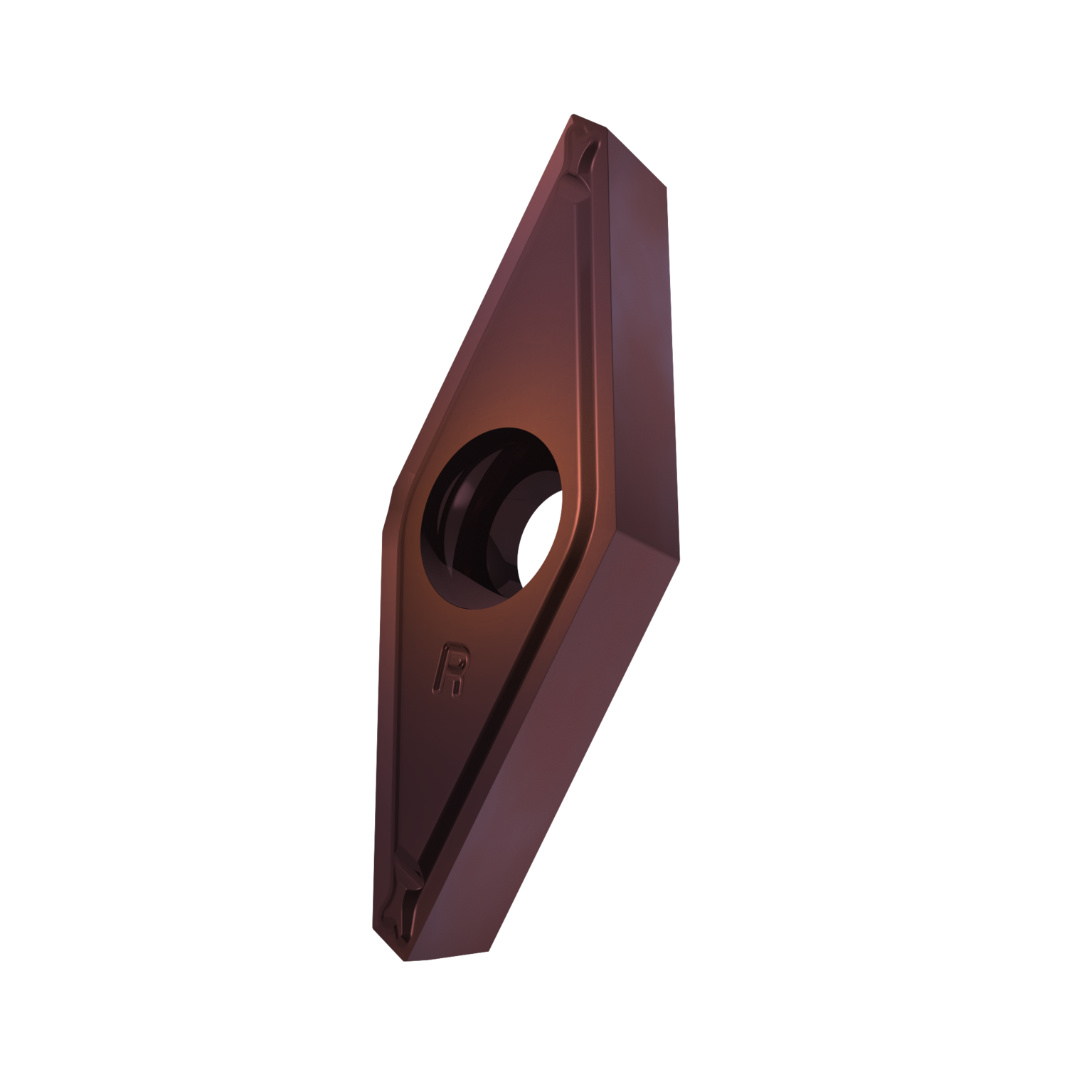 Plaquita de torneado positiva, Diseño especial, rómbica de 35° con 7° de incidencia, diámetro del círculo inscrito de 0.313 inch, 0.125 inch de espesor, radio de punta de 0.004 inch, precisión de montaje con tolerancia según ISO clase G, rompevirutas FF2 con preparación del filo filos de corte vivos en calidad T8415.
