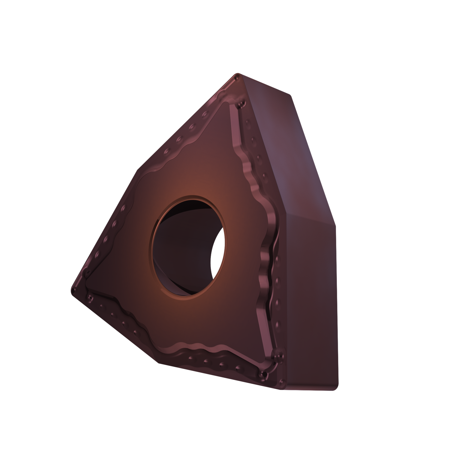 Plaquita de torneado negativa, de doble cara, trigona de 80° con diámetro del círculo inscrito de 0.5 inch, 0.187 inch de espesor, radio de punta de 0.016 inch, precisión de montaje con tolerancia según ISO clase M, rompevirutas FF con preparación del filo filos de corte redondeados en calidad T8415.